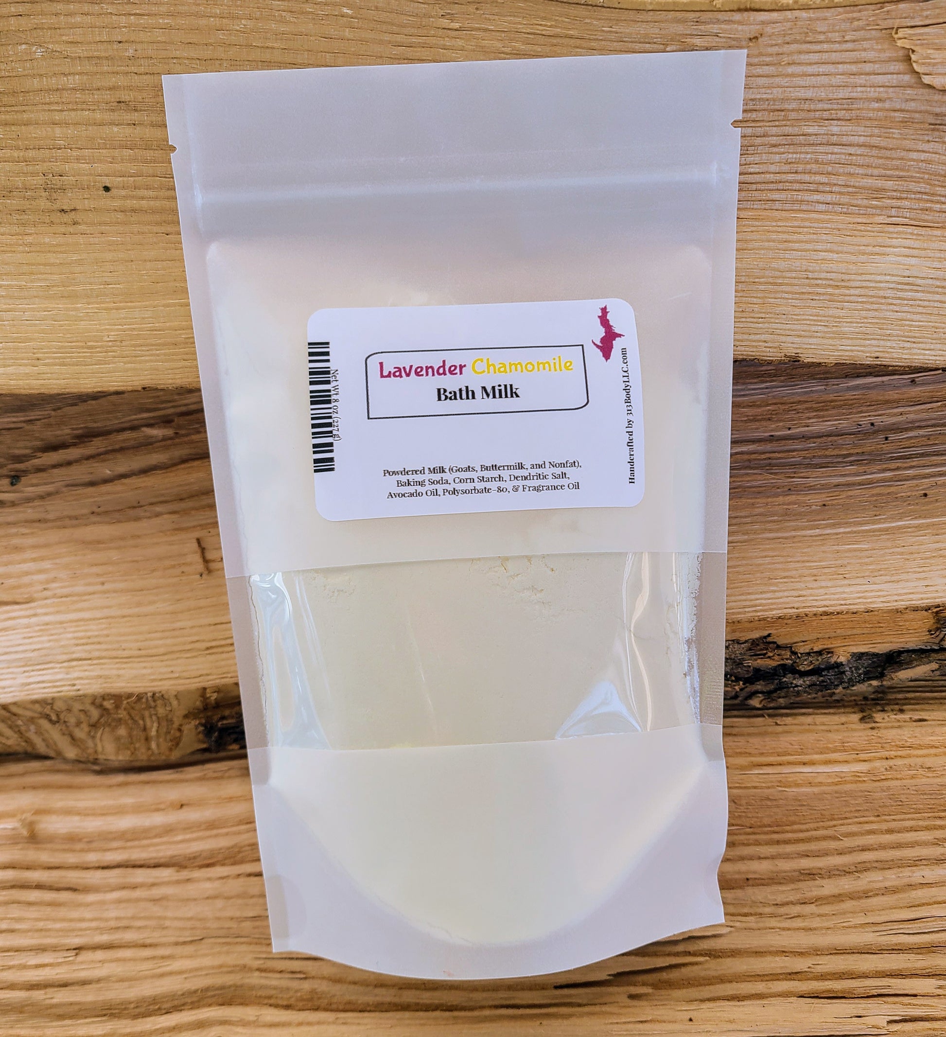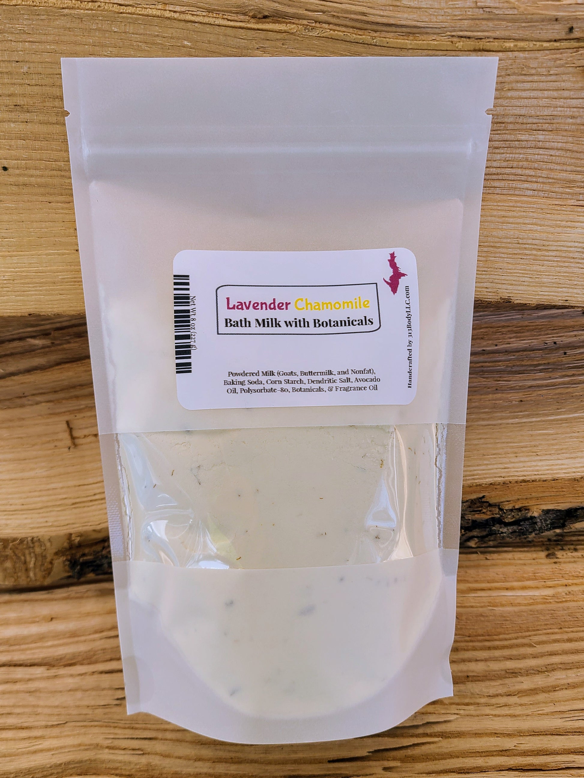 Our Bath Milk is made Powdered Milk (Goats, Buttermilk, and Nonfat), Baking Soda, Corn Starch, Dendritic Salt, Avocado Oil, Polysorbate-80, (Botanicals), and Fragrance Oil
