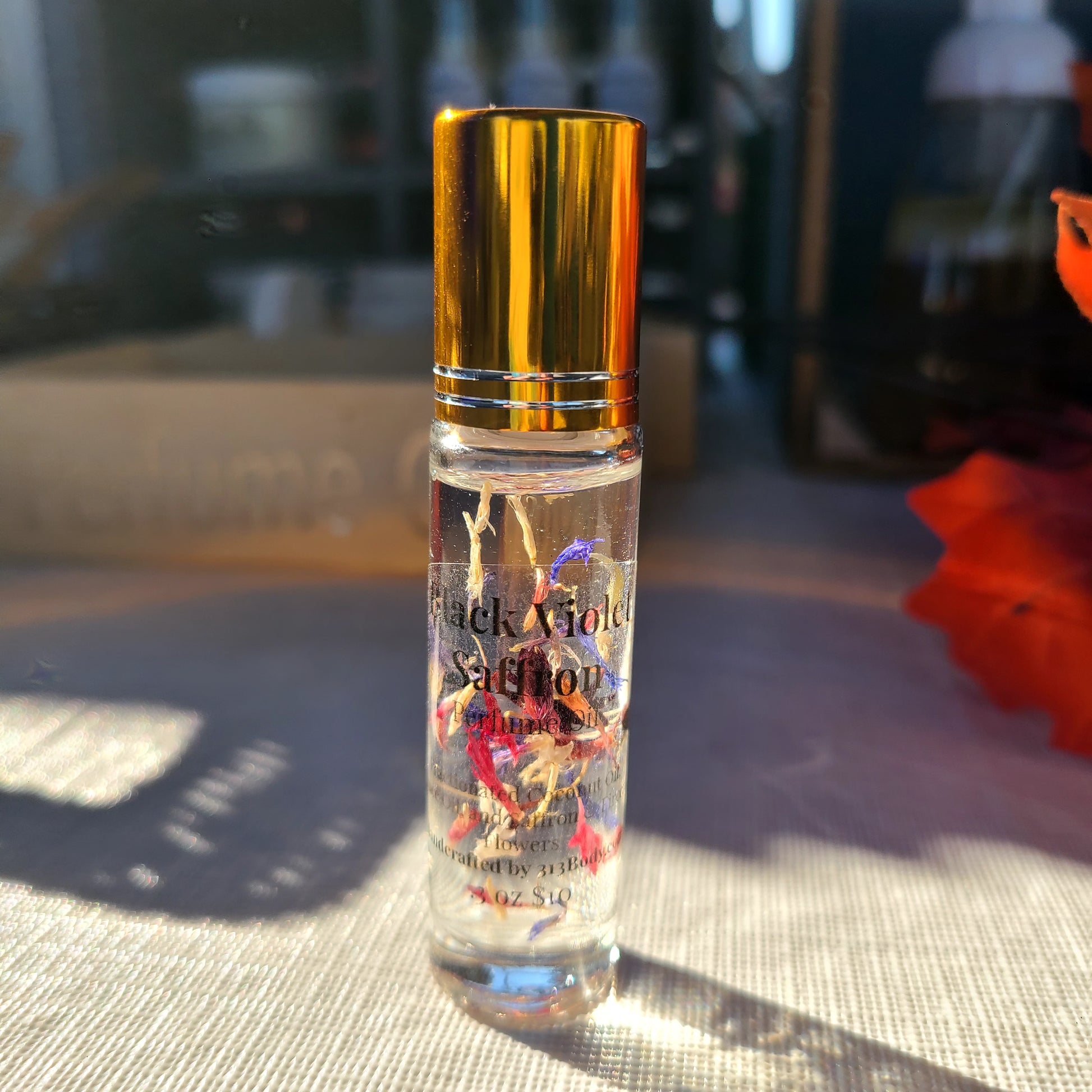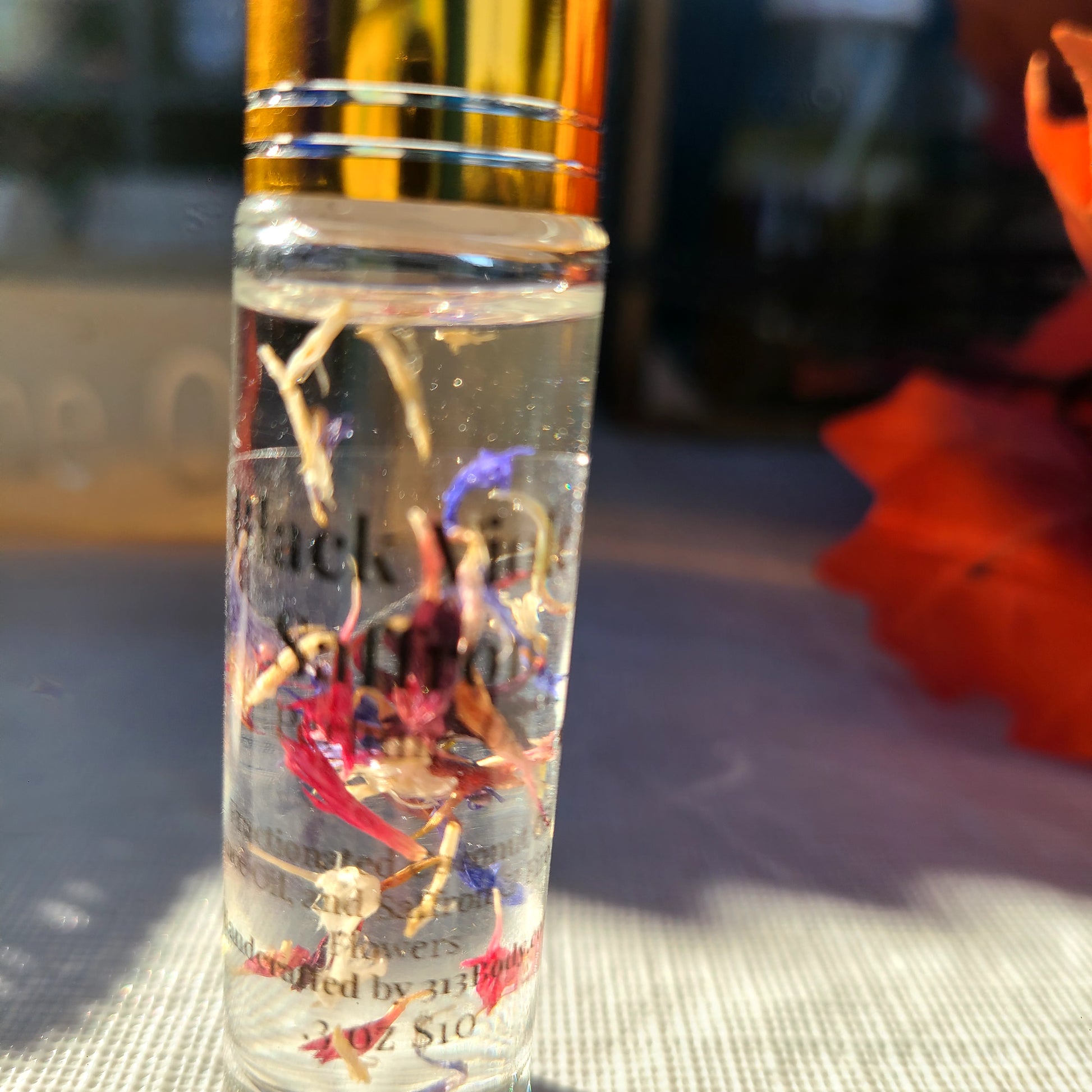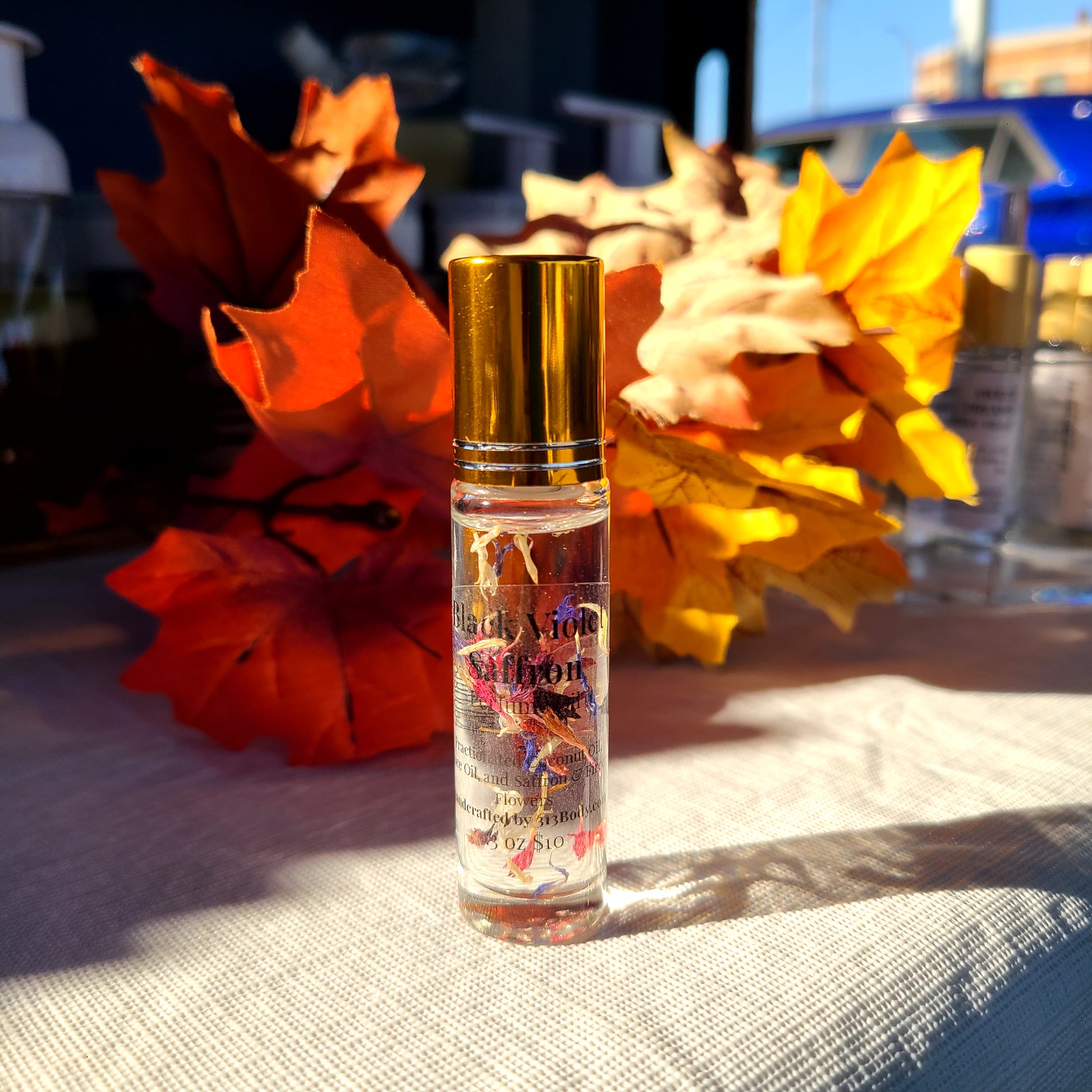 Our handmade Perfume Oil is made with Fractionated Coconut Oil, Fragrance Oil, and Saffron & Firecracker Cornflowers