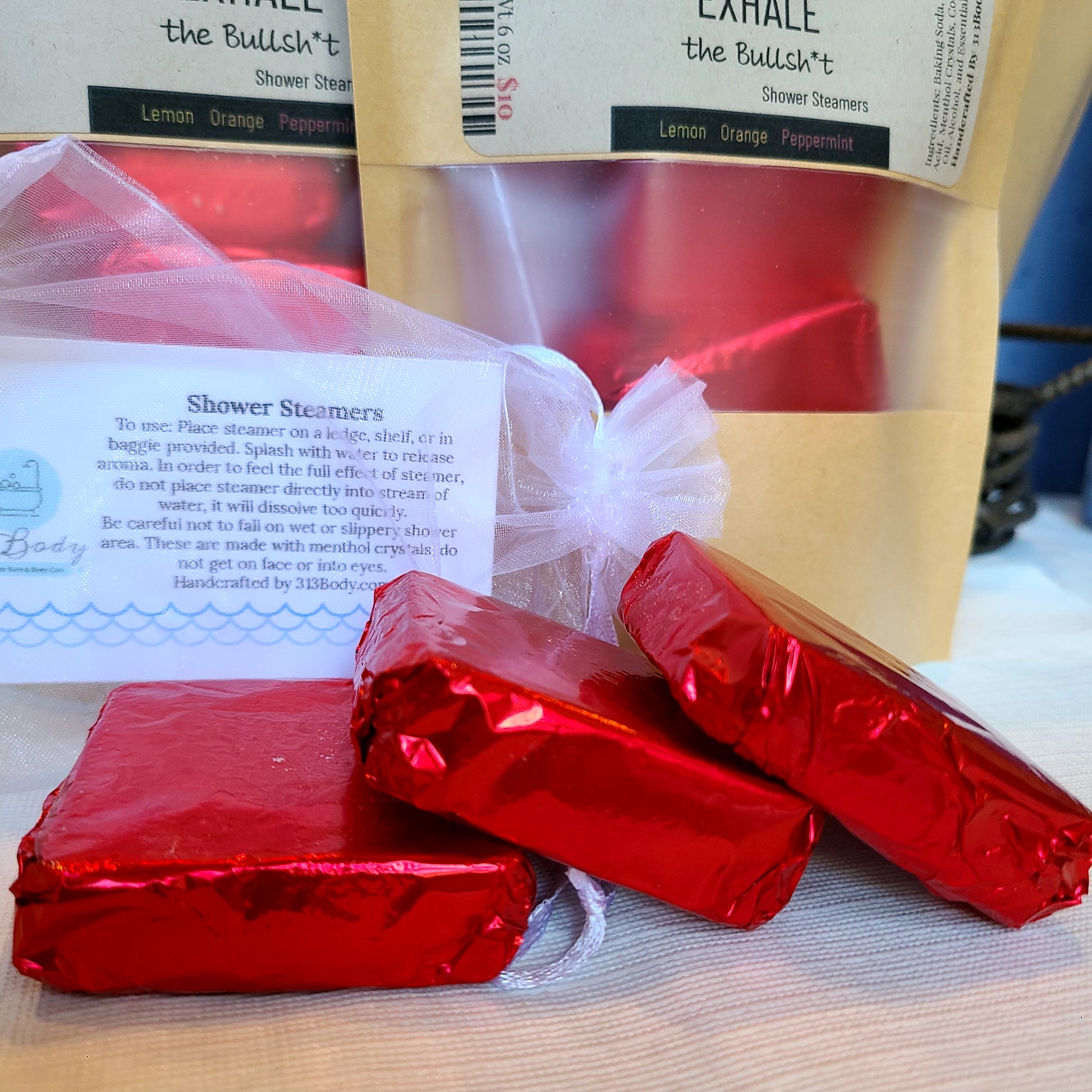 Our handmade Shower Steamer contains Baking Soda, Citric Acid, Menthol Crystals, Coconut Oil, Alcohol, and Essential Oil