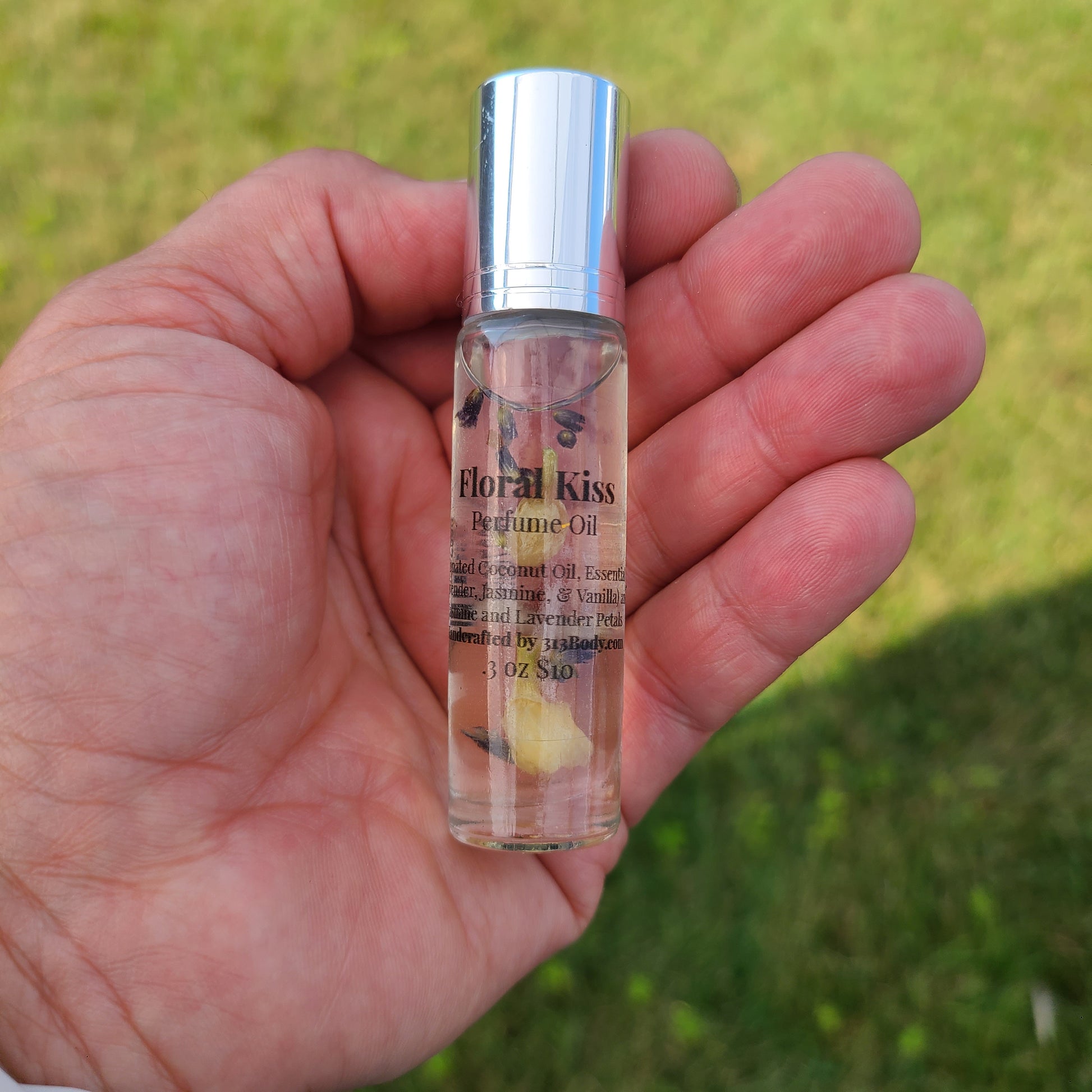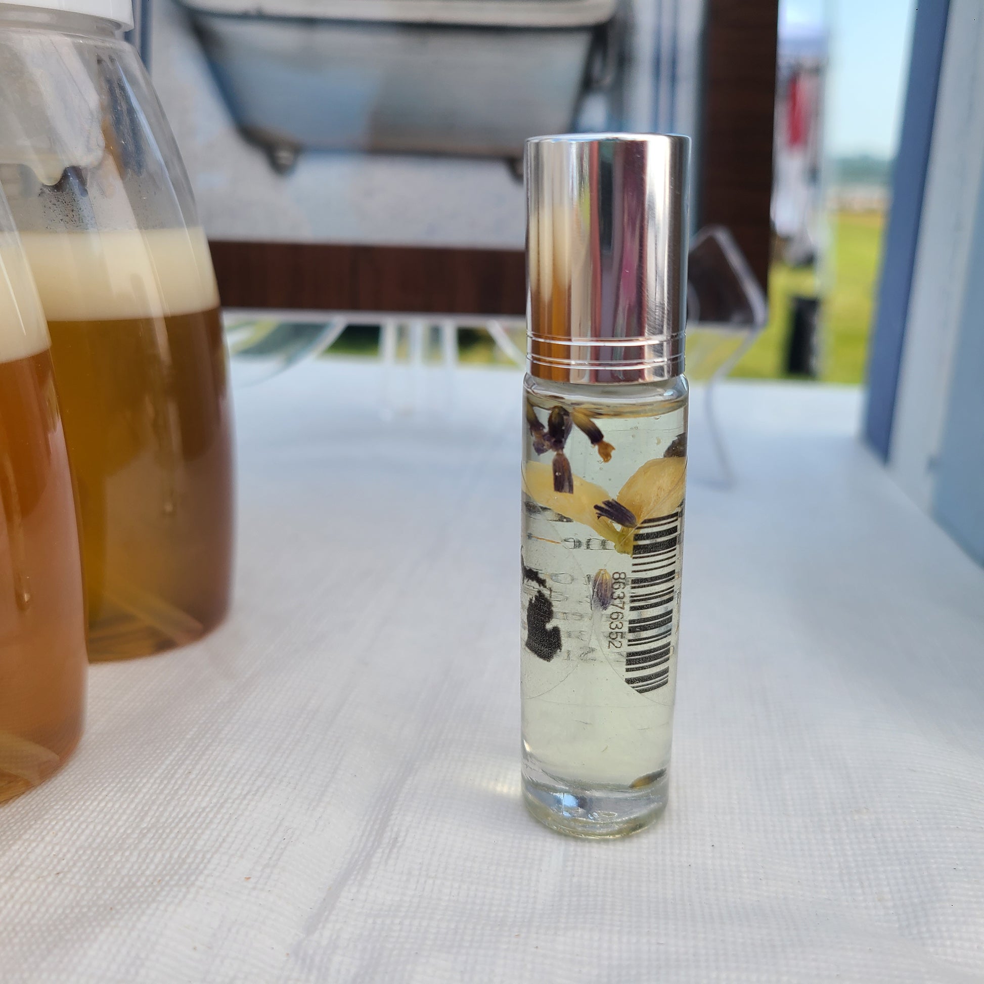 Our handmade Perfume Oil is made with Fractionated Coconut Oil, Essential Oils (Lavender, Jasmine, & Vanilla), and Jasmine & Lavender Petals