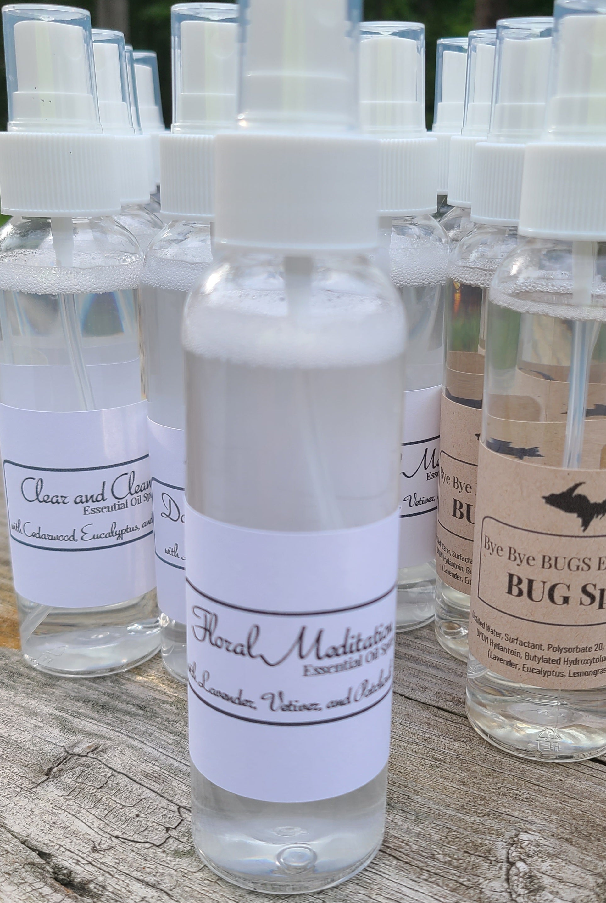 Our handcrafted spray is made with Water, Surfactant, Polysorbate 20, Dipropylene Glycol, Glycerin, Essential Oils, DMDM Hydantoin, and Butylated Hydroxytoluene (BHT)