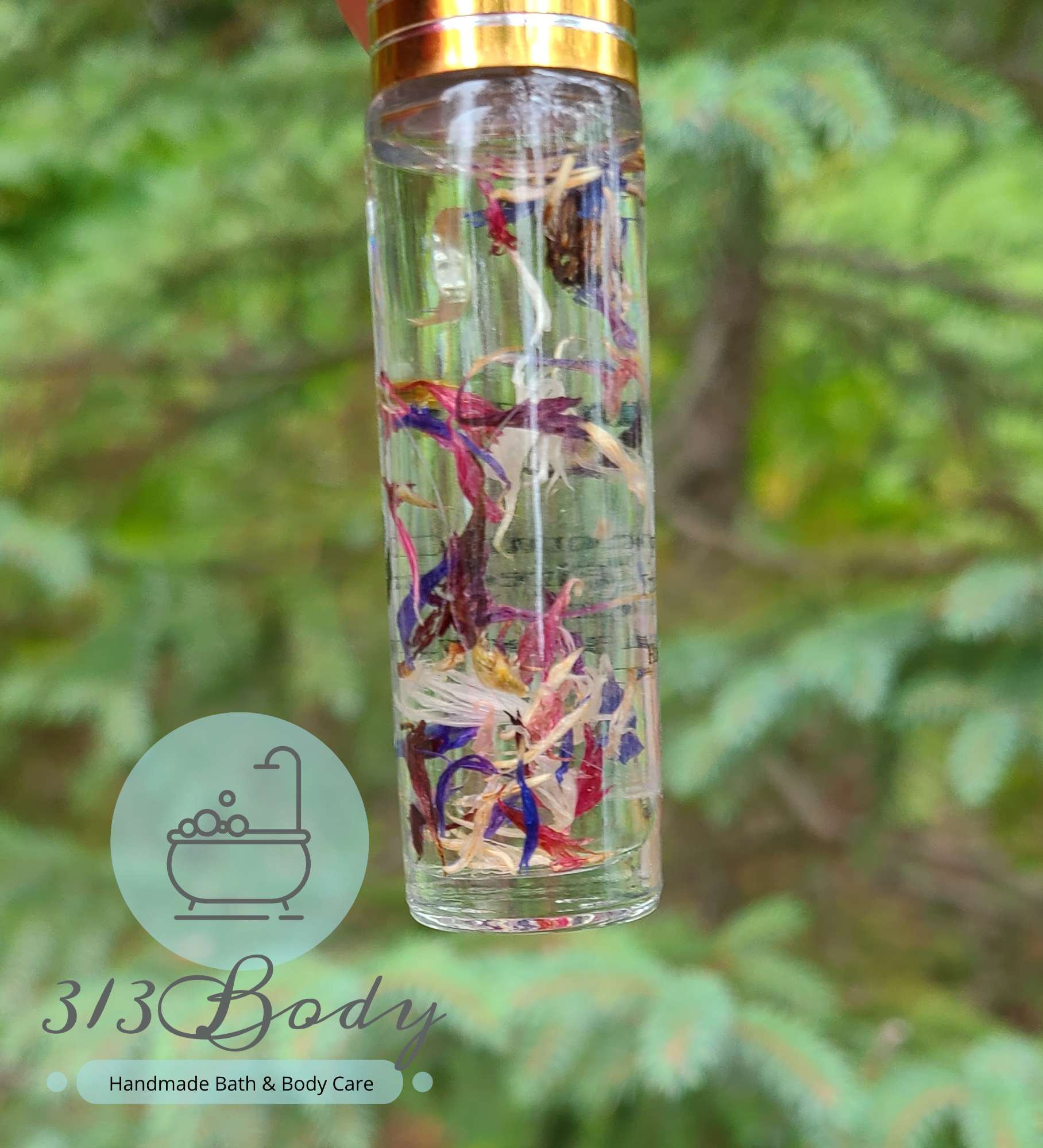 Our handmade Perfume Oil is made with Fractionated Coconut Oil, Fragrance Oil, and Firecracker Cornflowers