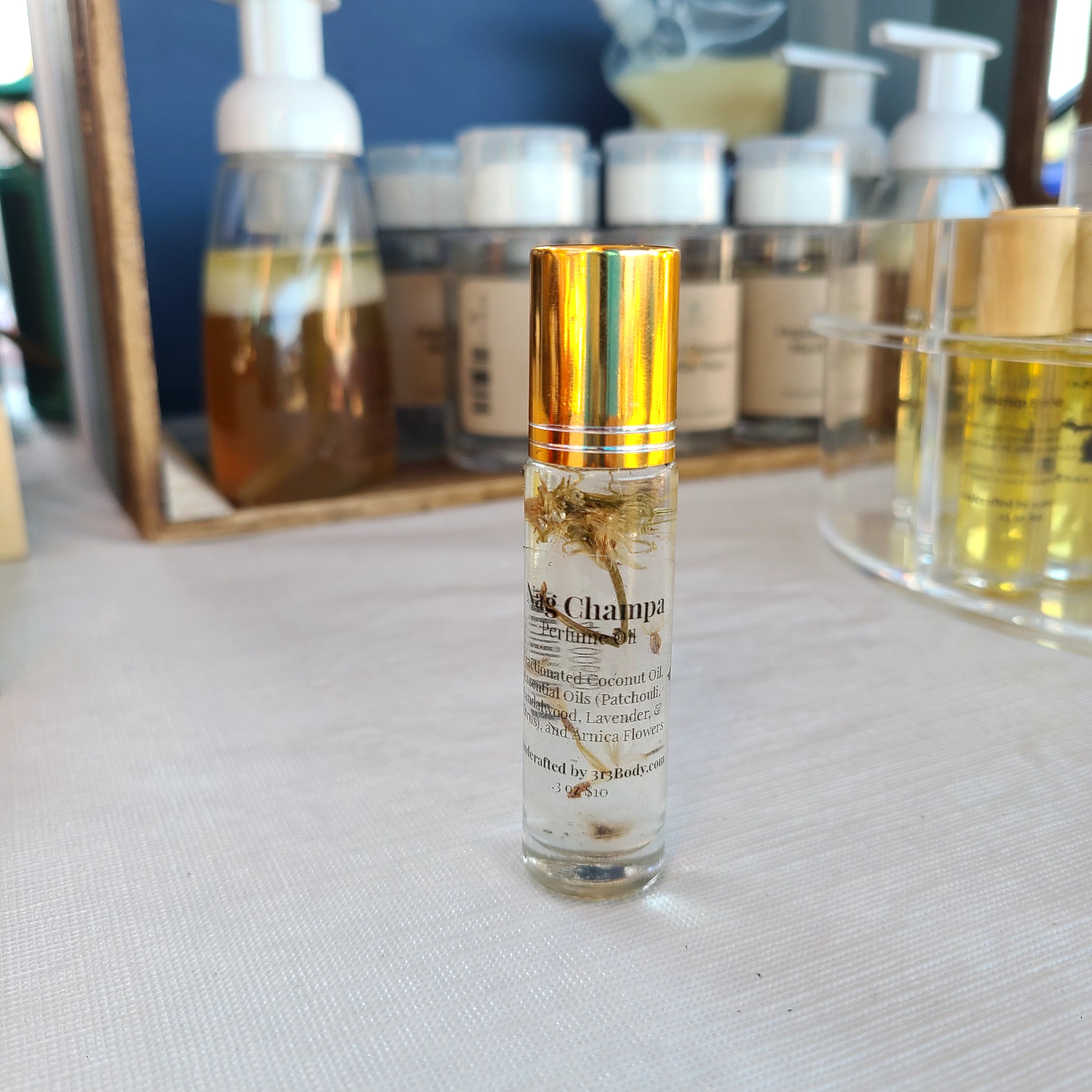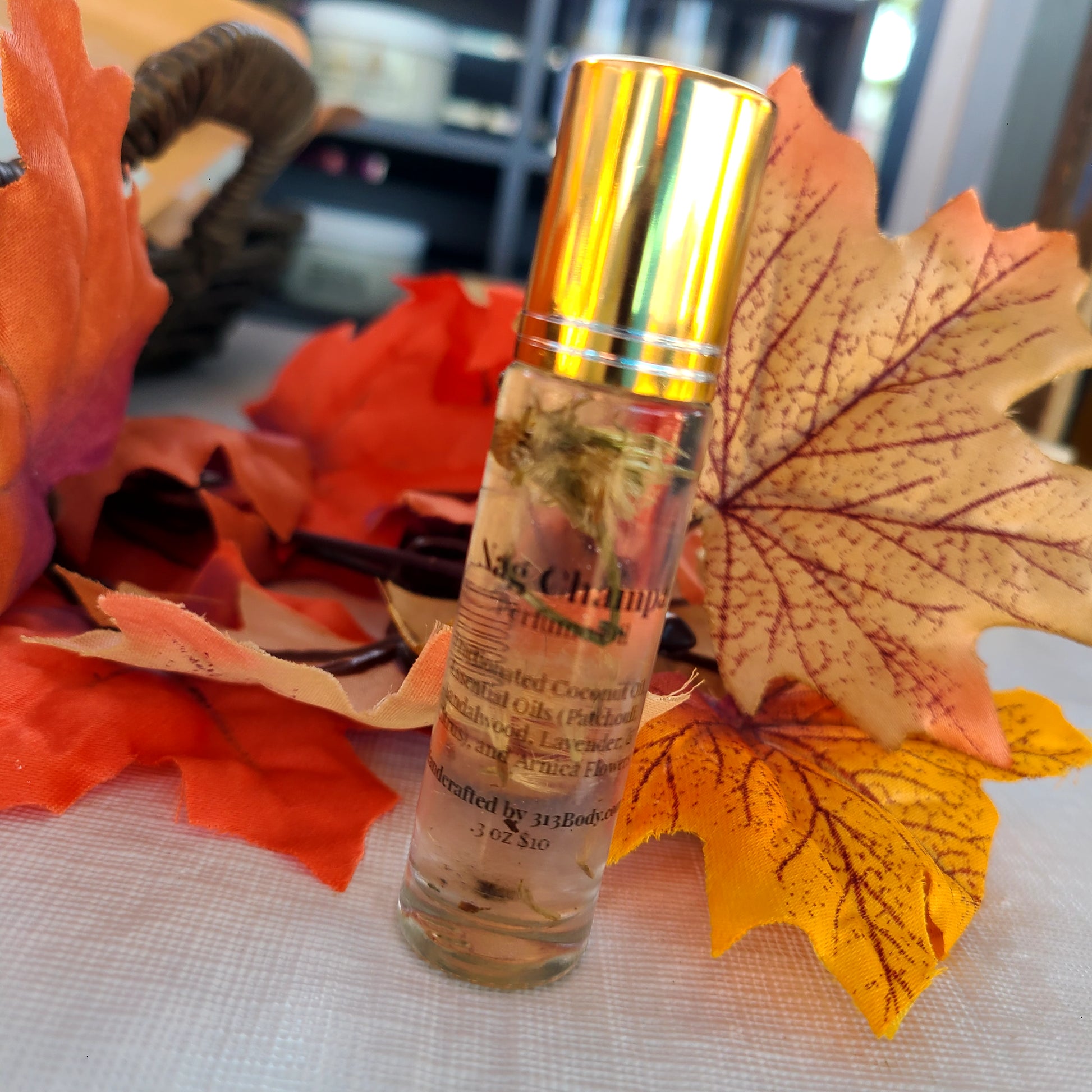 Our handmade Perfume Oil is made with Fractionated Coconut Oil, Essential Oils (Patchouli, Sandalwood, Citrus, and Lavender), and Arnica Flowers