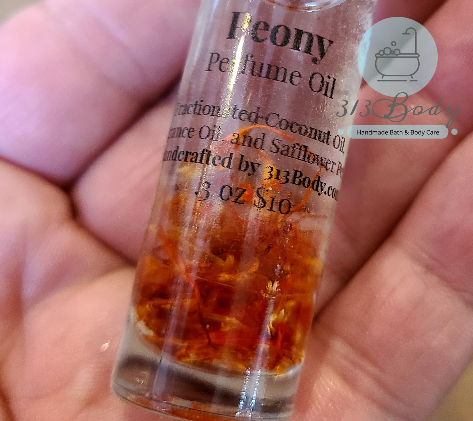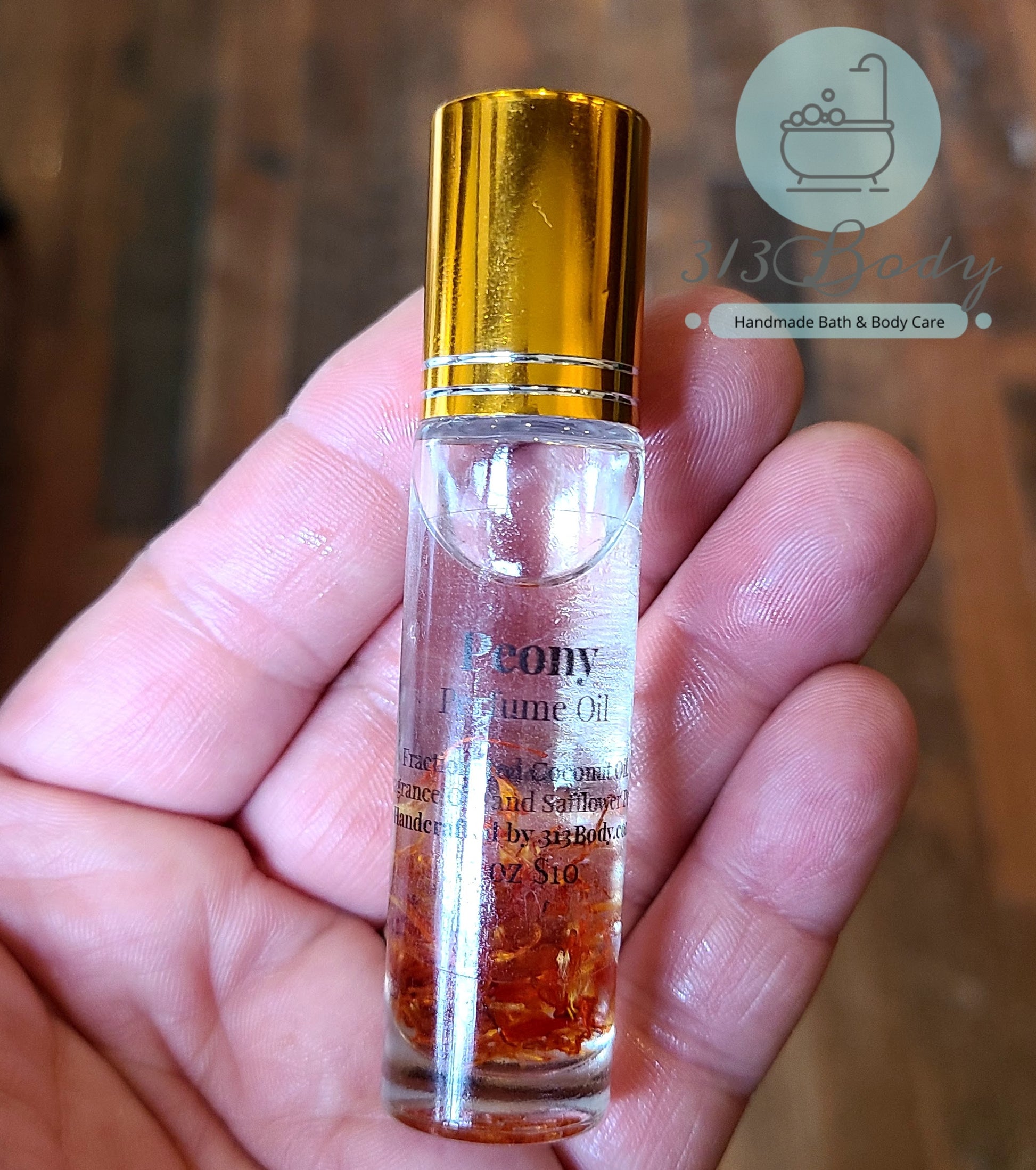 Our handmade Perfume Oil is made with Fractionated Coconut Oil, Fragrance Oil, and Safflower Petals