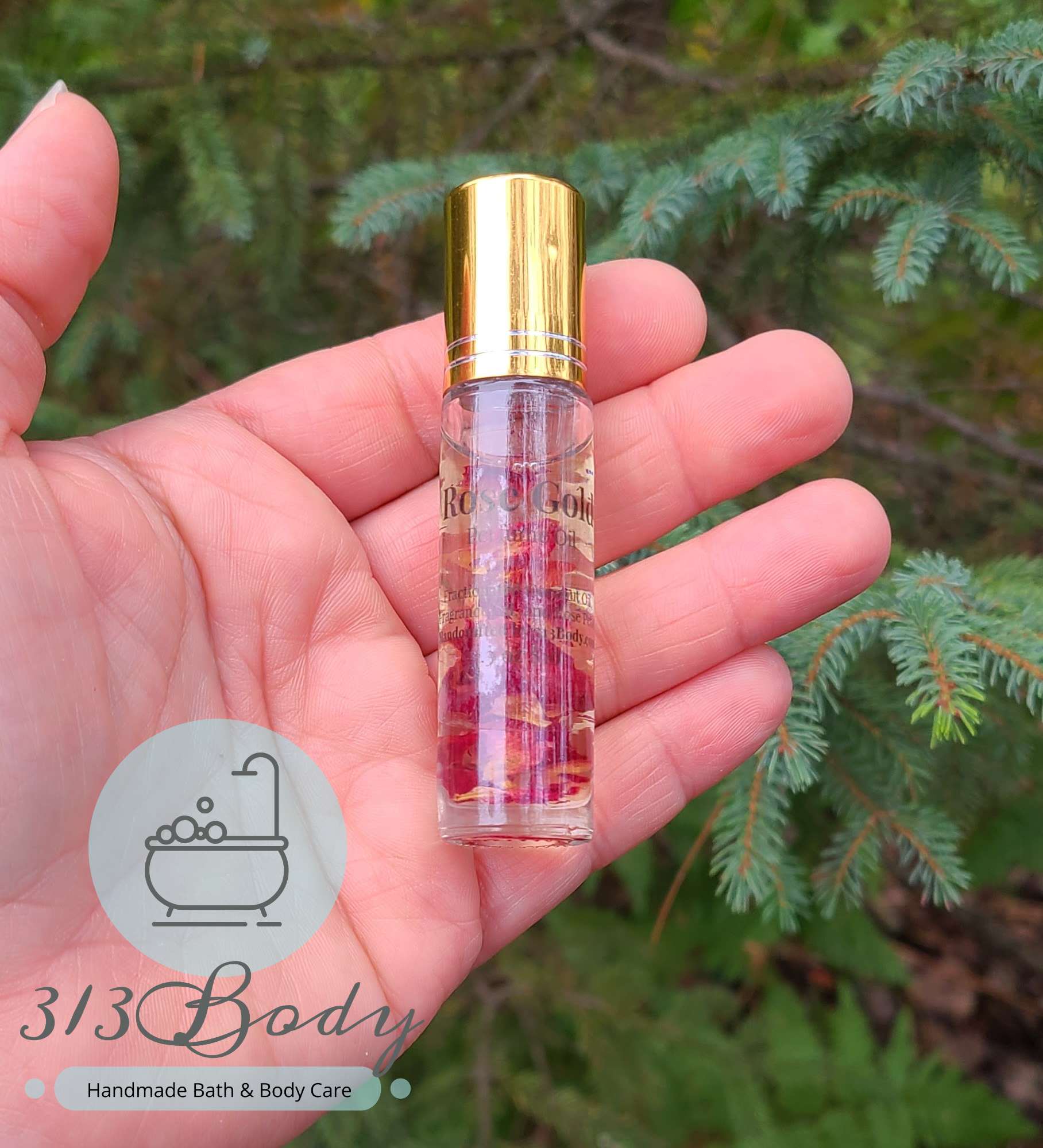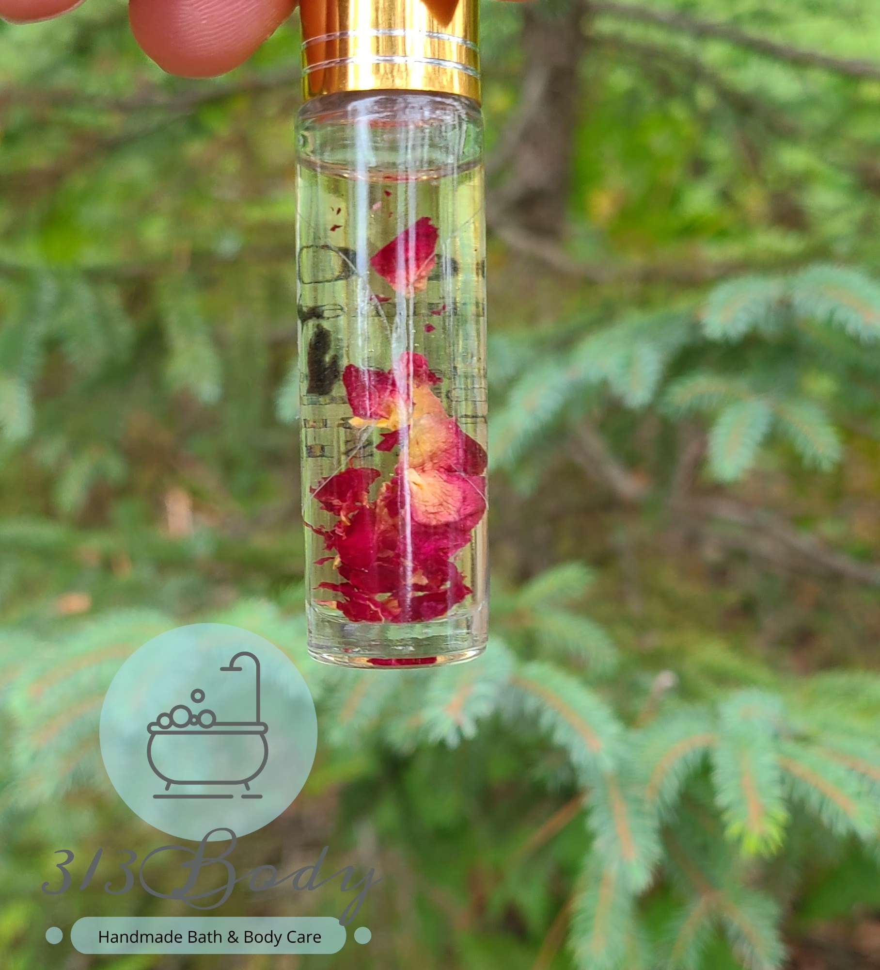 Our handmade Perfume Oil is made with Fractionated Coconut Oil, Fragrance Oil, and Rose Petals