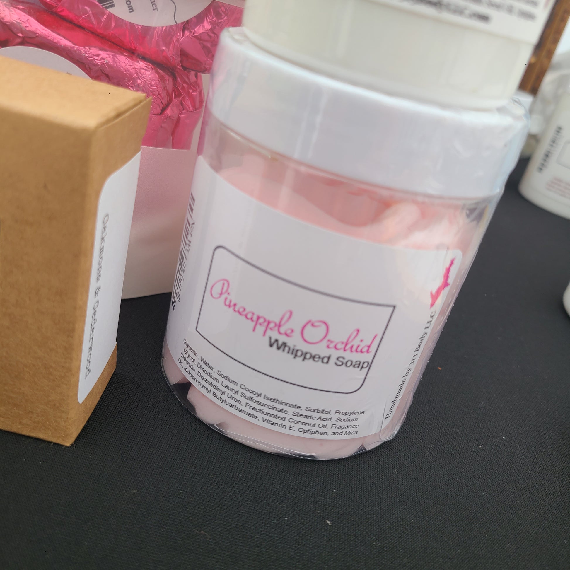 Whipped Soap is made with Glycerin, Sorbitol, Purified Water, Sunflower Oil, Myristic Acid, Stearic Acid, Sodium Cocoyl Isethionate, Disodium Lauryl Sulfosuccinate, Sodium Chloride, Diazolidinyl Urea, Iodopropynyl Butylcarbamate, Tetrasodium EDTA, and Mica