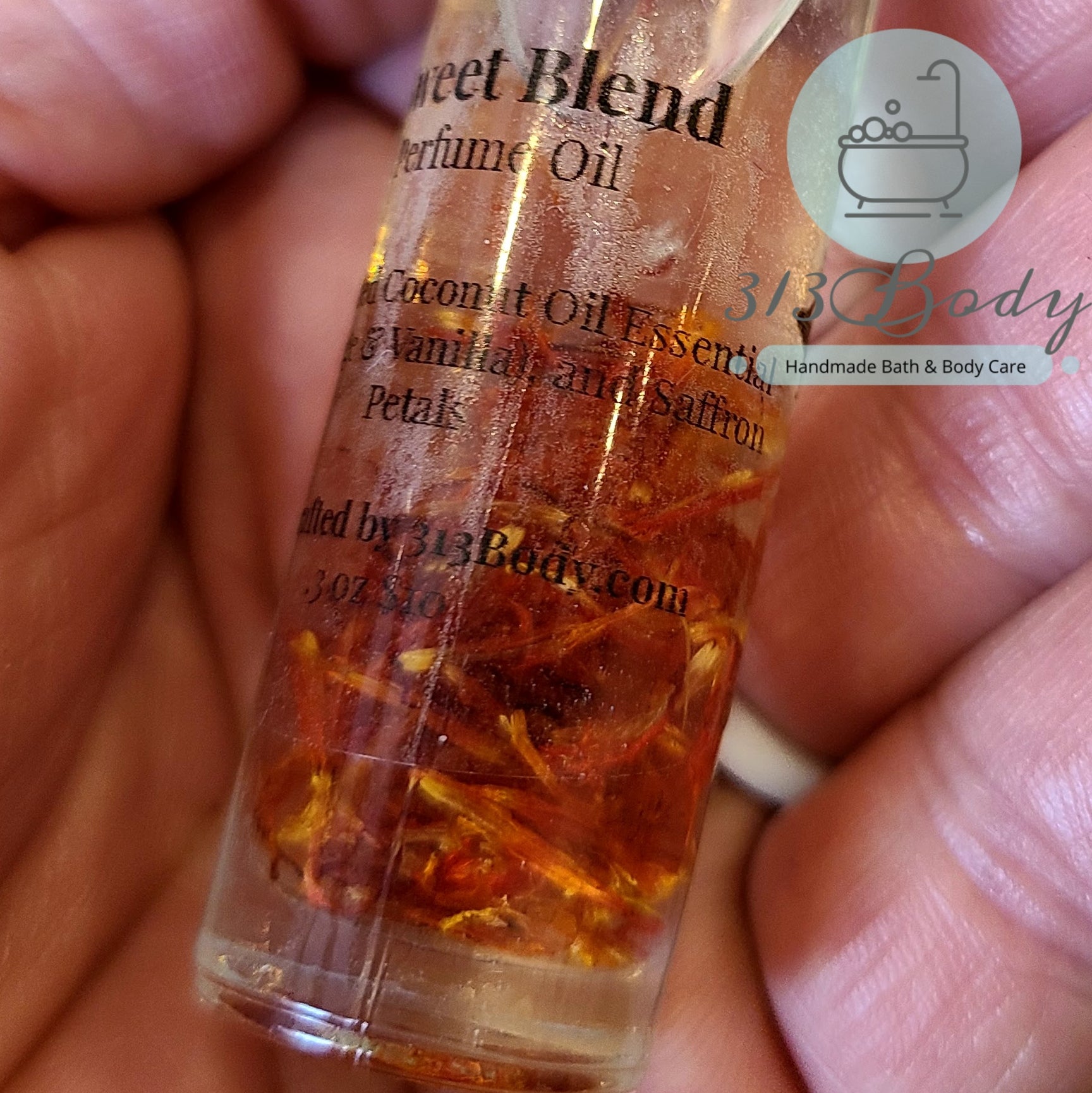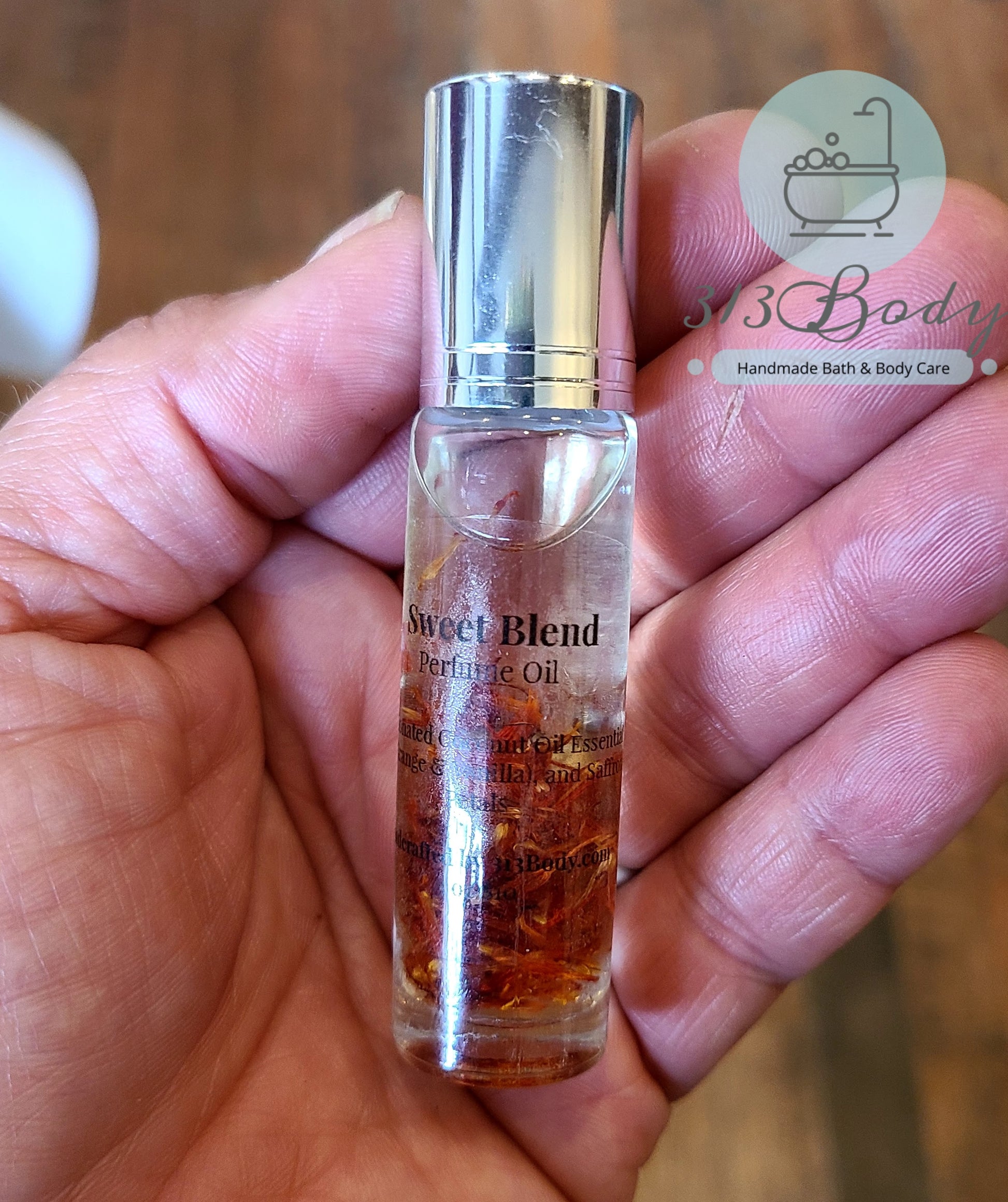 Our handmade Perfume Oil is made with Fractionated Coconut Oil, Essential Oils (Orange & Vanilla), and Safflower Petals