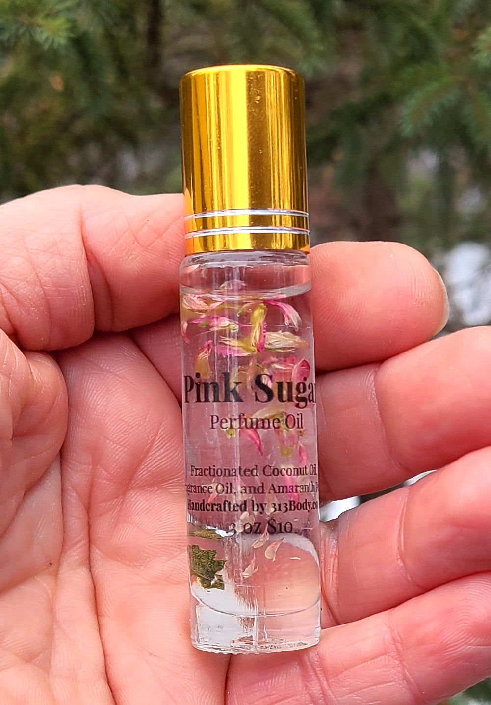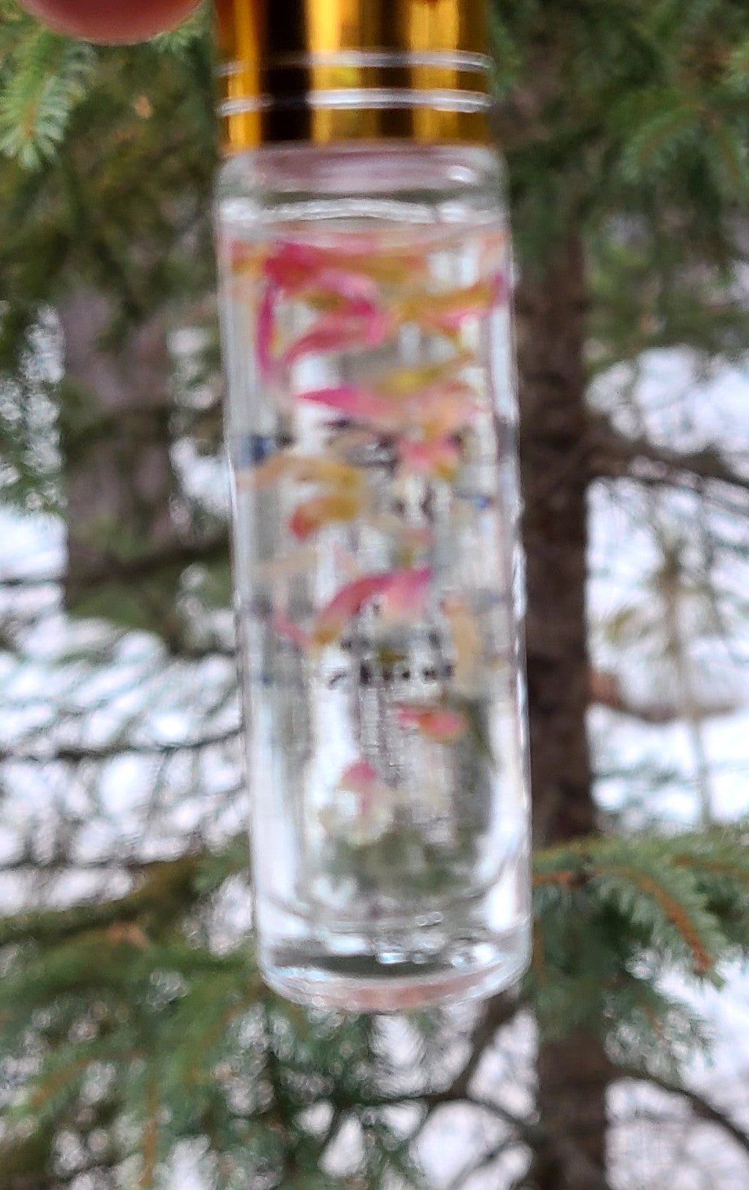 Our handmade Perfume Oil is made with Fractionated Coconut Oil, Fragrance Oil, and Amaranth Petals