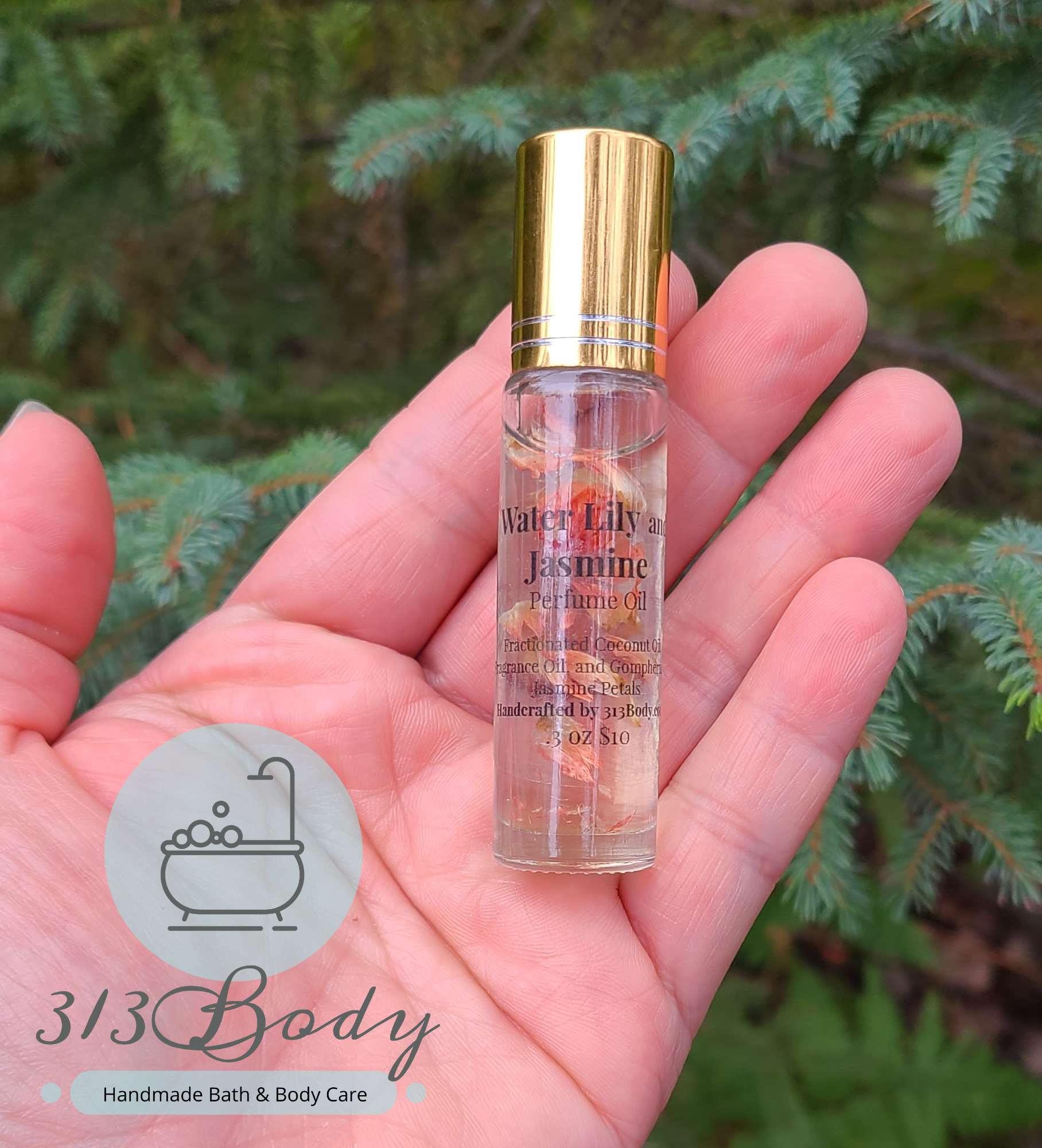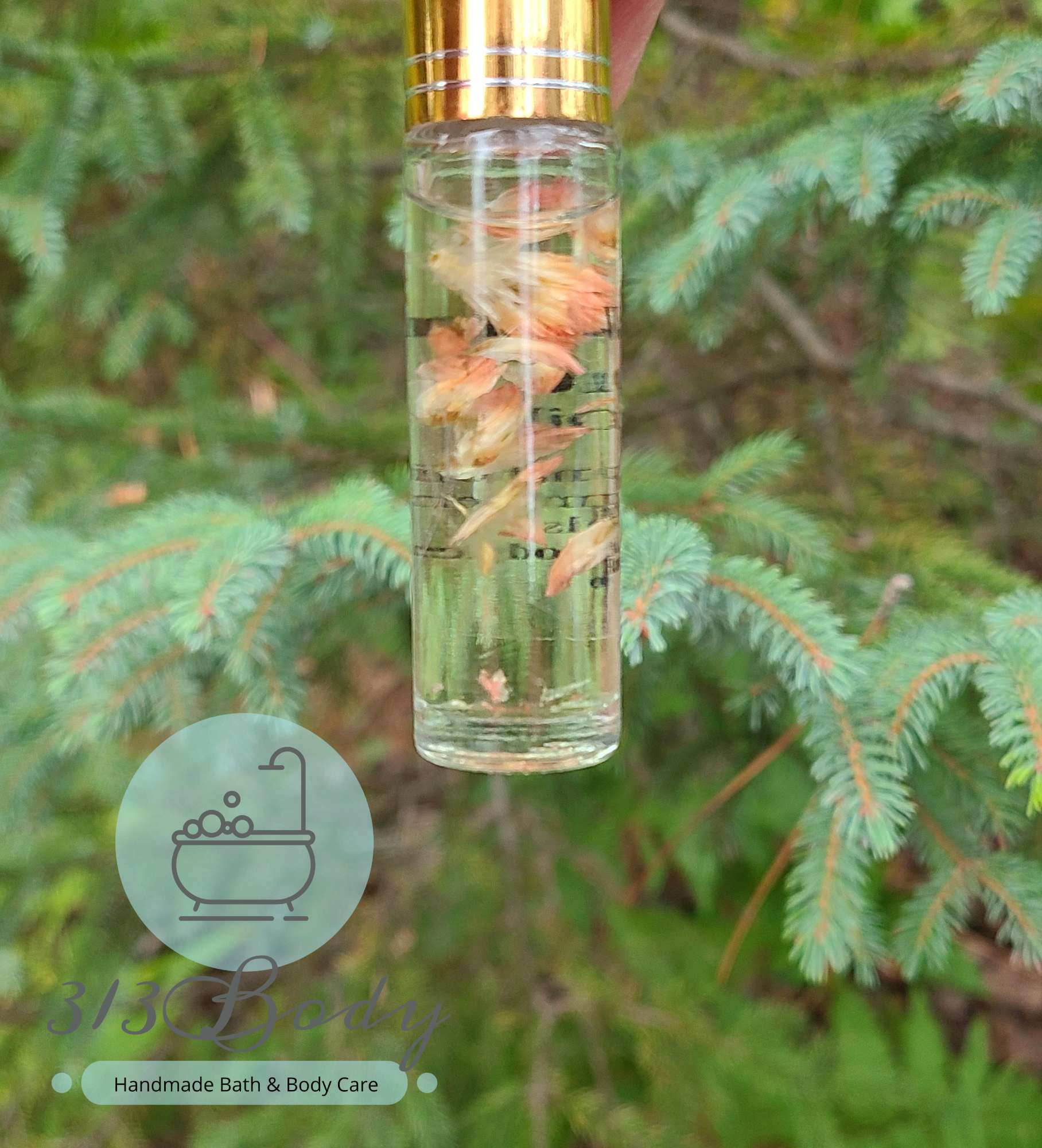 Our handmade Perfume Oil is made with Fractionated Coconut Oil, Fragrance Oil, and Gomphrena Globosa & Jasmine Flowers